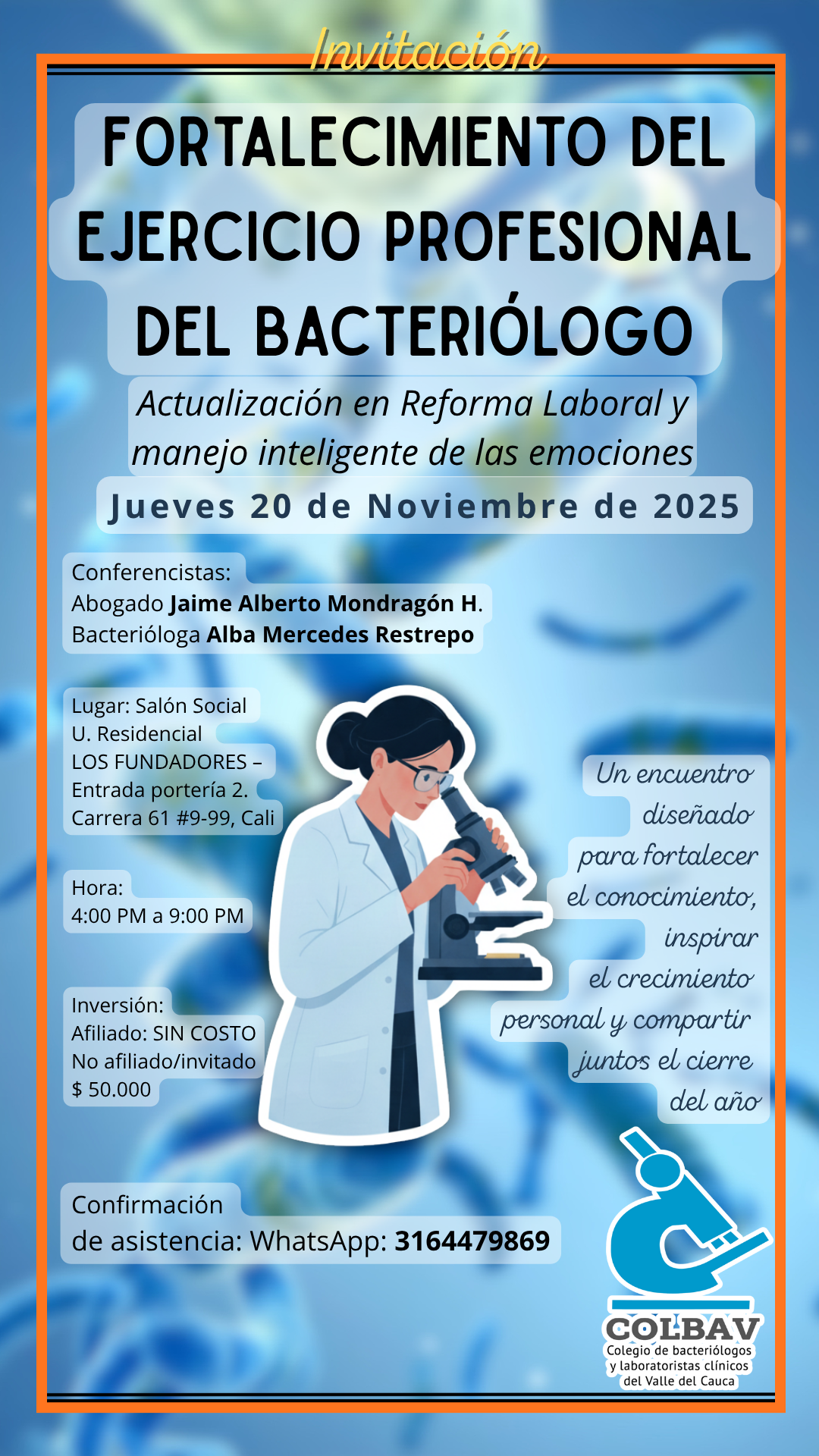 El colegio de Bacteriólogos del Valle COLBAV ofreció en días pasados, a todos sus afiliados, una conferencia acerca del Dengue, por ser un tema coyuntural para la salud pública en la ciudad de Cali. La charla fue dictada por el doctor Jorge Humberto Rojas Palacios, Medico MSC Epidemiología , de la Secretaría de Salud Municipal.
